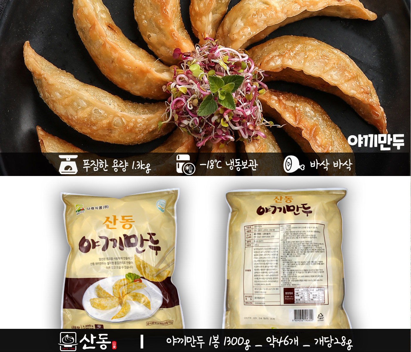 제품특징 | 엄선된 원료를 사용하여 정성을 다해 만들어진 군만두는 특유의 풍부한 맛과 담백한 맛을 그대로 살린 정통 군만두입니다. |